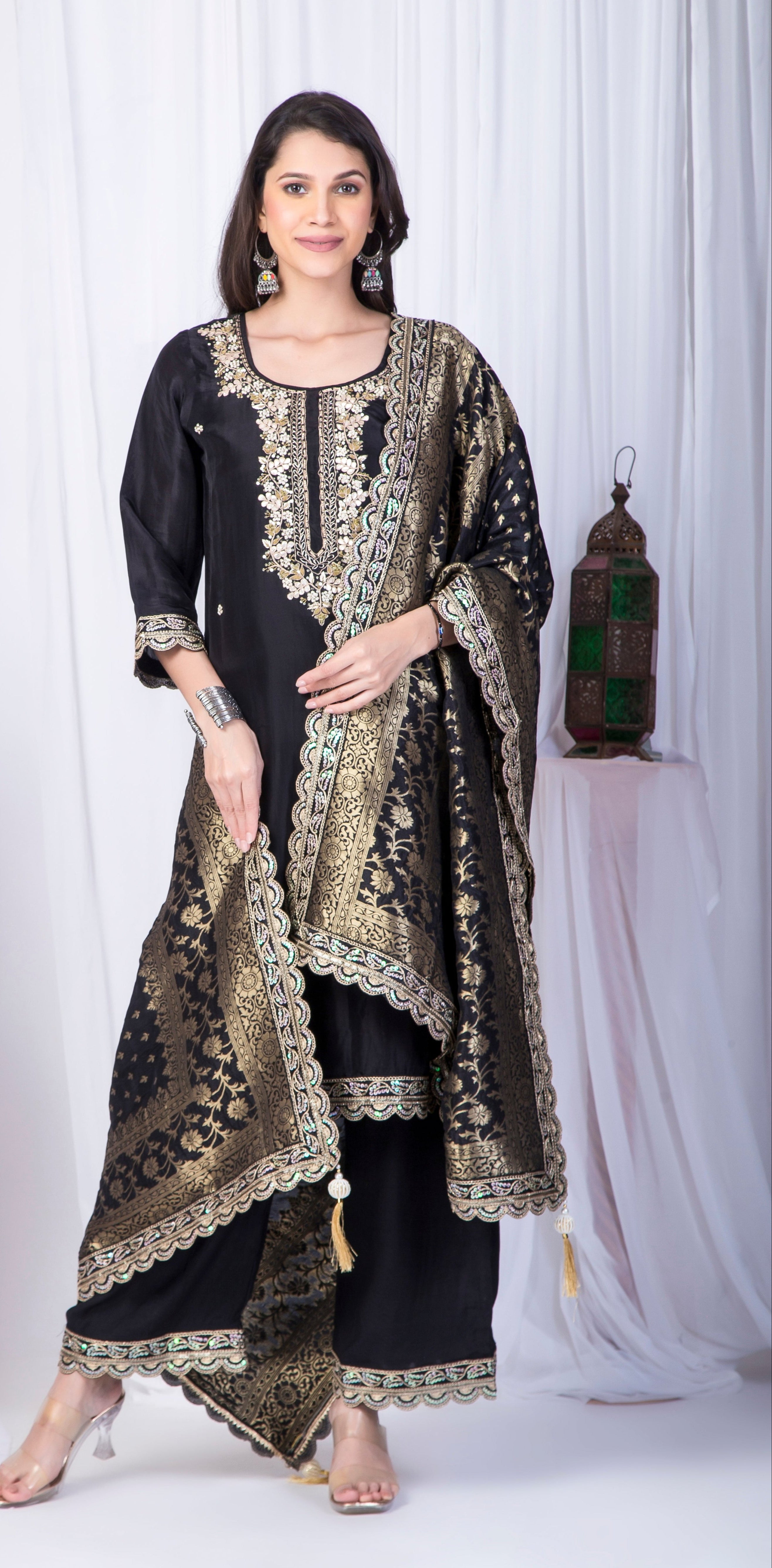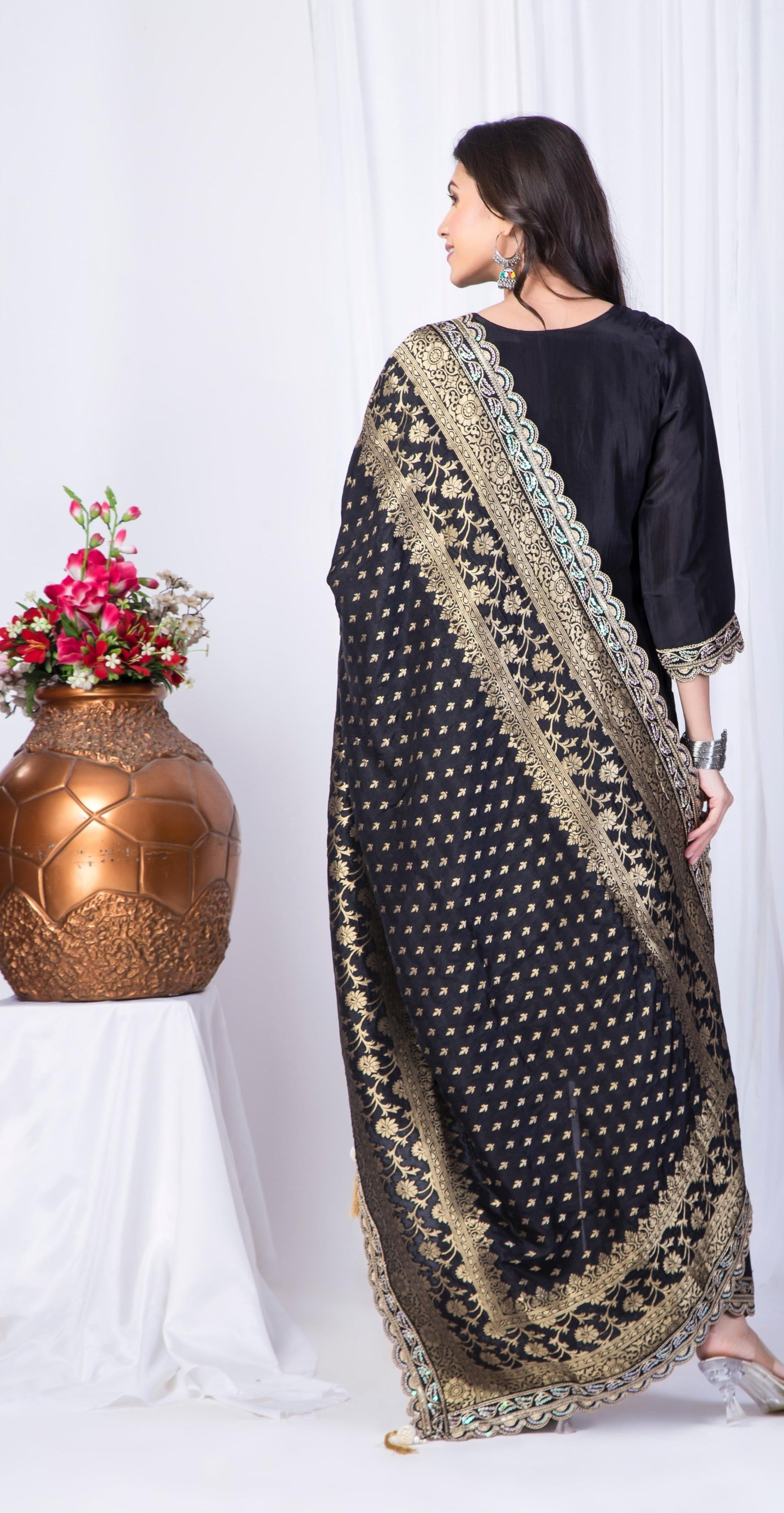 Bring out the grace in this golden zardosi work Suit Set that is crafted from pure crepe silk paired with rich royal dupatta !