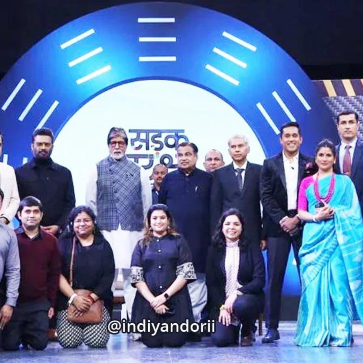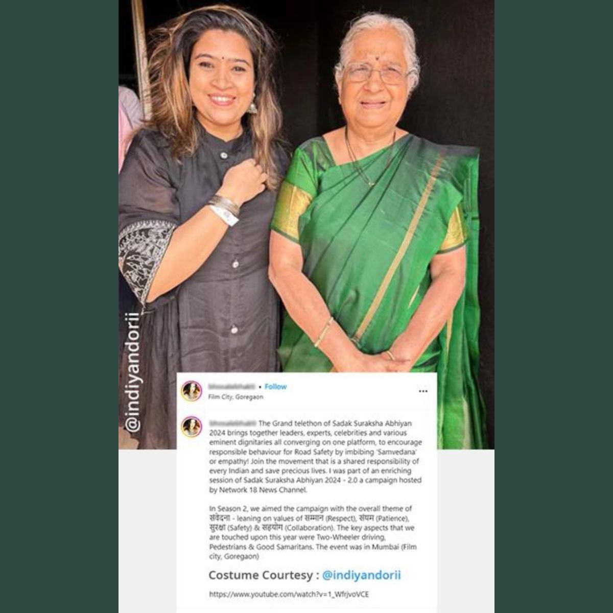 Celebrating culture and advocacy at Sadak Suraksha Abhiyan 2024, as awell-known anchor shines in Indian Dori attire alongside Hon. Sudha Murthy.