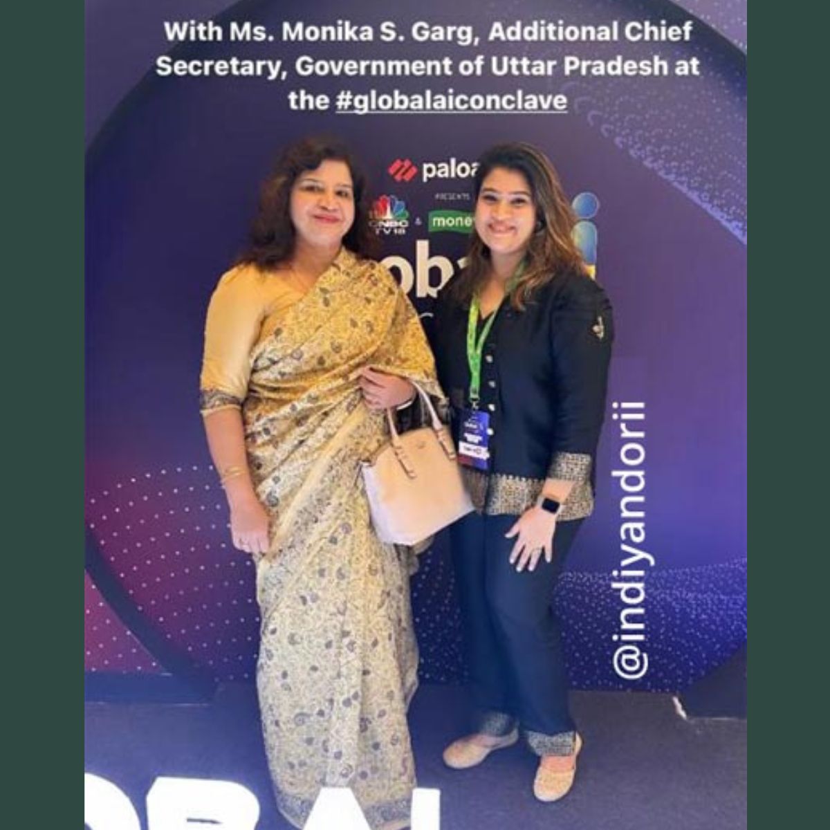 Captured in the rich hues of Indian Dori attire, a well-known news channel anchor graces the Sadak Suraksha Abhiyan 2024 event, standing alongside the esteemed Additional Chief Secretary of the Government of Uttar Pradesh.