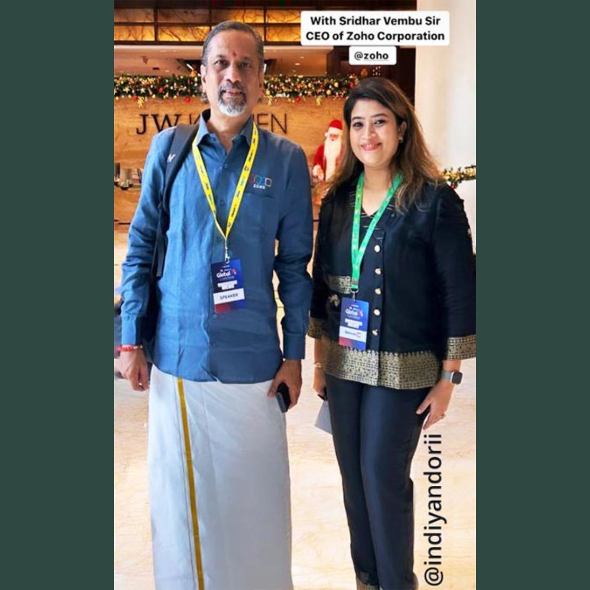 An enchanting moment at Sadak Suraksha Abhiyan 2024, where a renowned anchor, adorned in Indian Dori attire, stands alongside the respected CEO of Zoho.