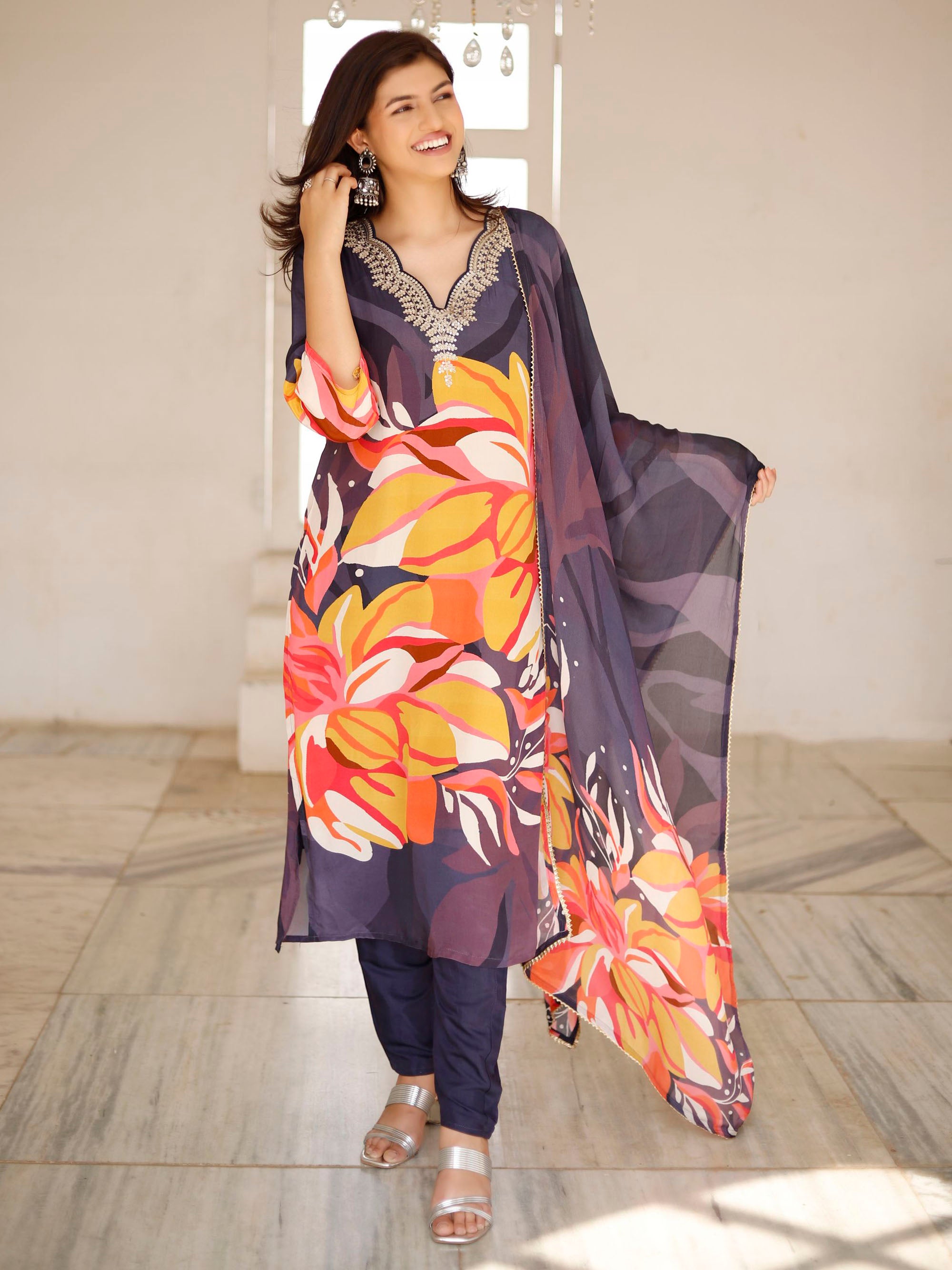 Dress in elegance with this Black and Maroon 3-piece suit set with an Alia cut kurti that is adorned with Block print, perfect for all occasions.